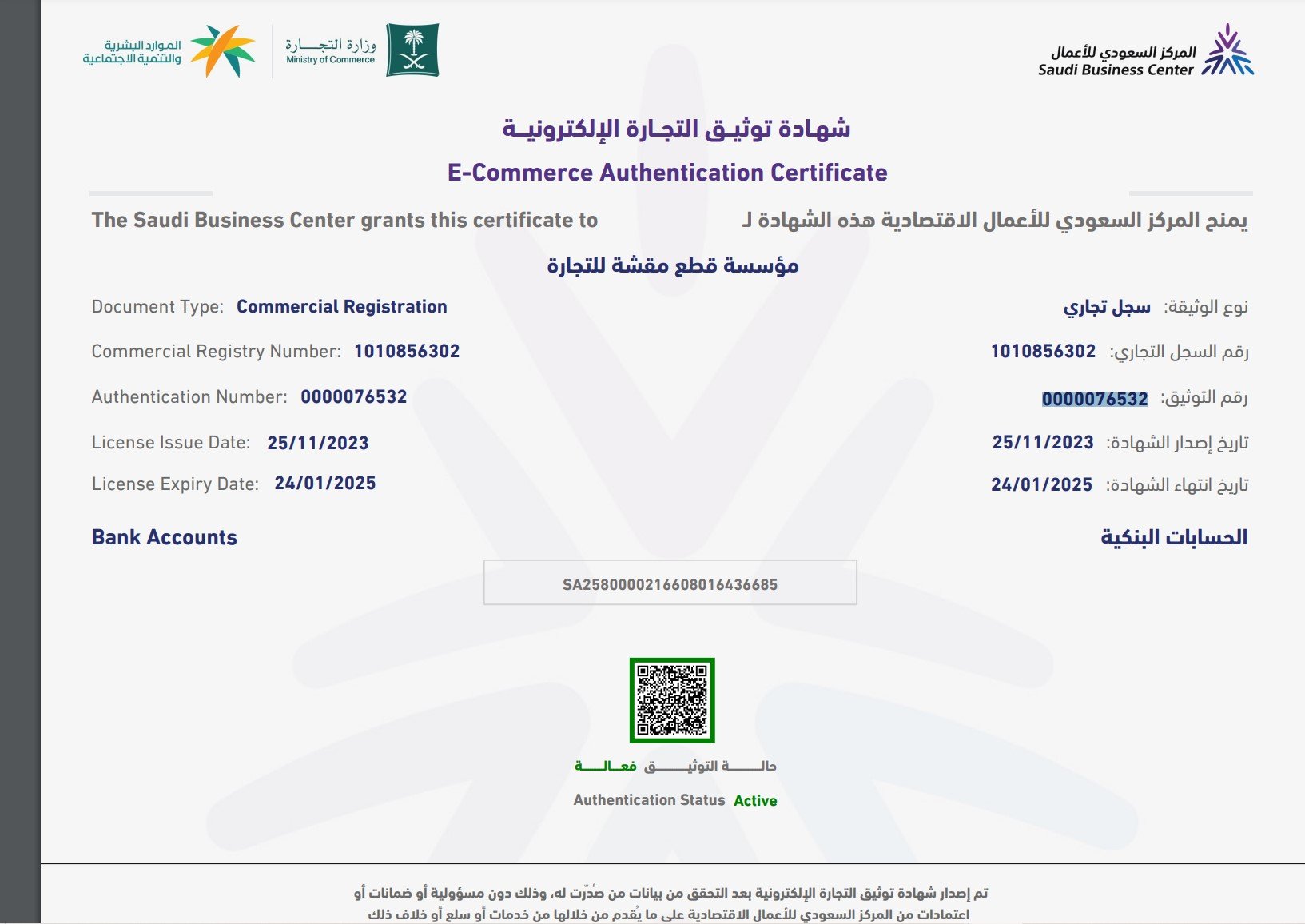 مرفق لكم ادناه توثيق المركز السعودي للأعمال لمتجر مقشة واعتماد الحسابات البنكية المرفقة فقط بالشهادة ادناه للتحويل حيث انها تكون تحت رقابة الجهات المعنية